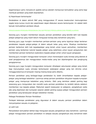 Pada era 60-an akronim kata multi media dalam taksonomi teknologi pendidikan bukan istilah yang asing. Dipergunakan dalam pendidikan sampai kepada yang secanggih mungkin yang dipakai dalam pendidikan sekarang ini. Soalan tersebut berkenaan jantina jenis aliran kelas tahap pencapaian dalam pendidikan Islam kekerapan penggunaan ICT dalam seminggu dan adakah pelajar menggunakan ICT semasa.